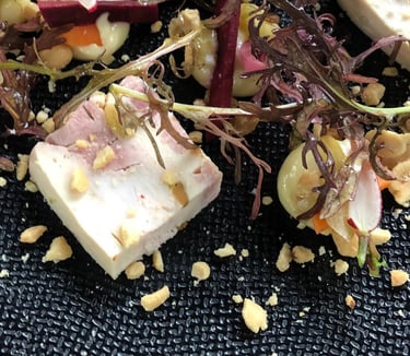 Chartreuse de volaille au foie gras, gel au port, pickles